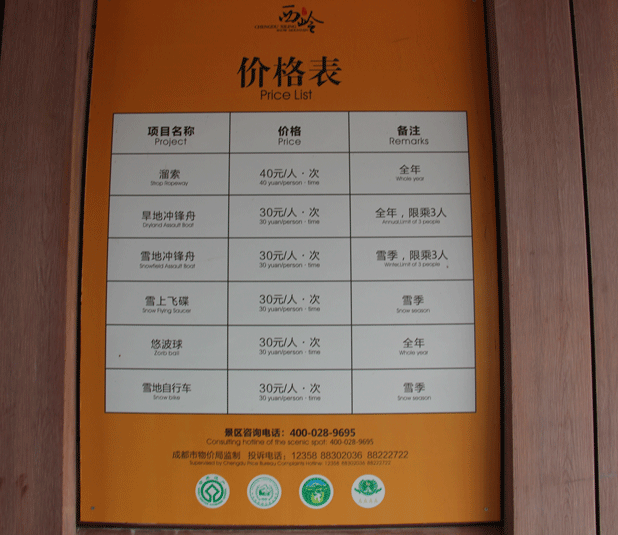西岭雪山部分消费价目表